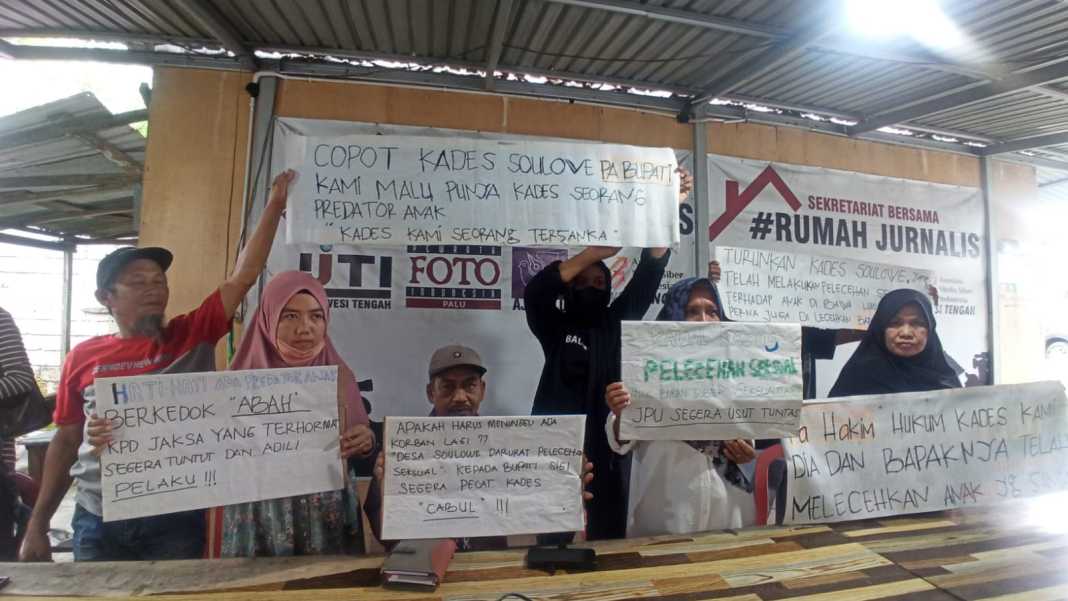 Kedatangan keluarga korban di Roemah Jurnalis yang ada di Jalan Ahmad Yani, Rabu (5/2/2025) membawa sejumlah tulisan tuntutan di antaranya meminta agar Kades Soulowe dicopot, karena malu punya Kades seorang predator anak.