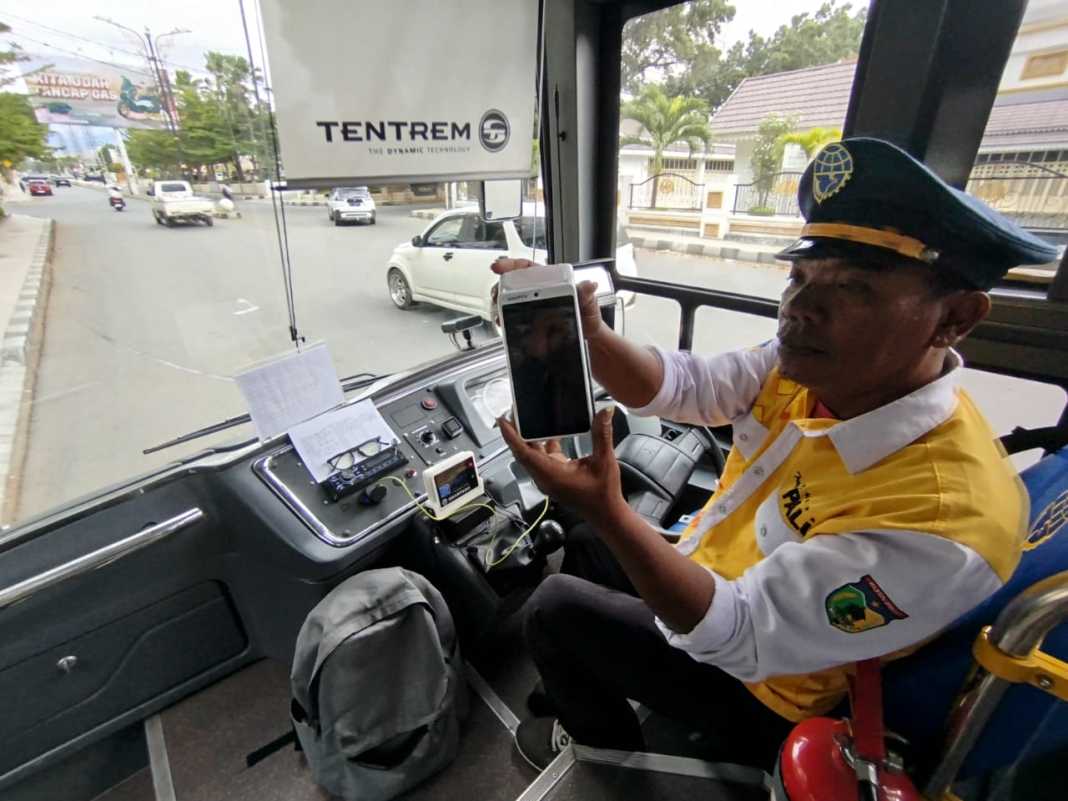 ALAT SCAN KARTU E-MONEY: Agus, sopir bus TP1-10, memperlihatkan alat scan kartu e-money, yang sudah disiapkan. Namun alat ini belum bisa difungsikan karena belum ada kartu khusus untuk Trans Bus Palu.(NUR SOIMA ULFA)