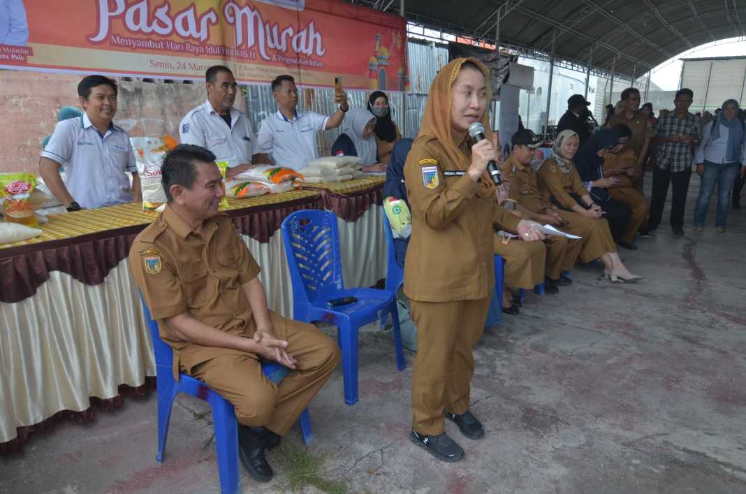 PASAR MURAH : Wakil Walikota Palu, Imelda Liliana Muhidin saat meninjau pasar murah yang diselenggarakan oleh PT CPM yang bekerjasama dengan Disprindag di Kelurahan Palupi.(Foto : Wahono)